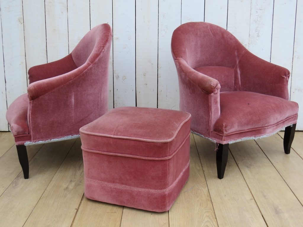 Pair of 1940s French Tub Chairs & Stool for re-upholstery