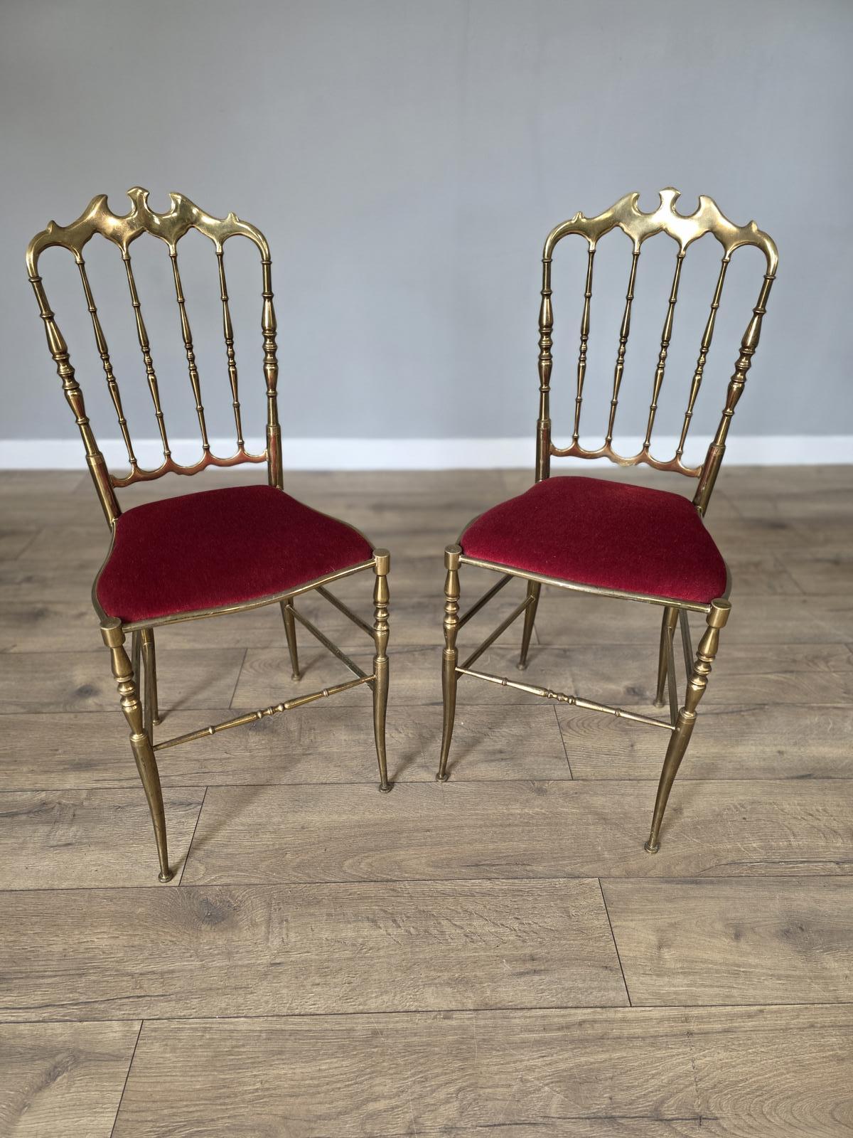 Pair of 1950s Italian Chiavari Brass & Red Velvet Chairs