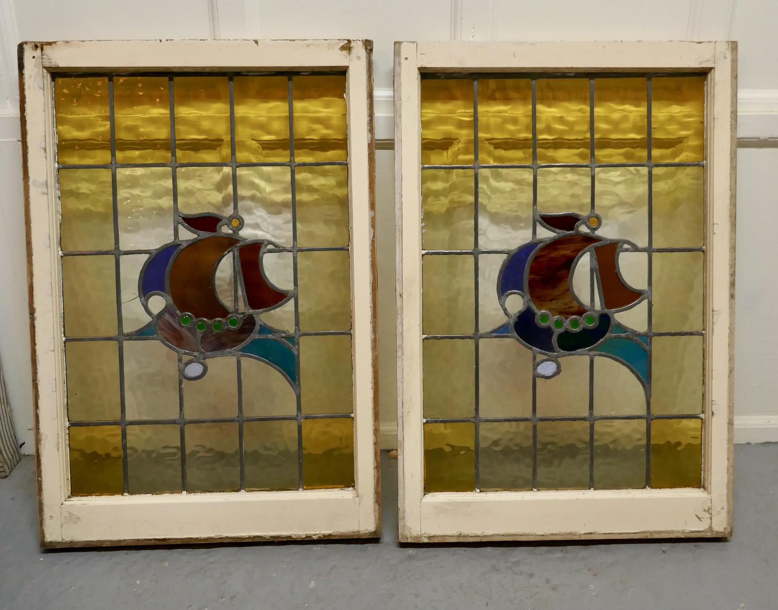 Pair of 19th Century Art Nouveau Stained Glass Windows, with Ships