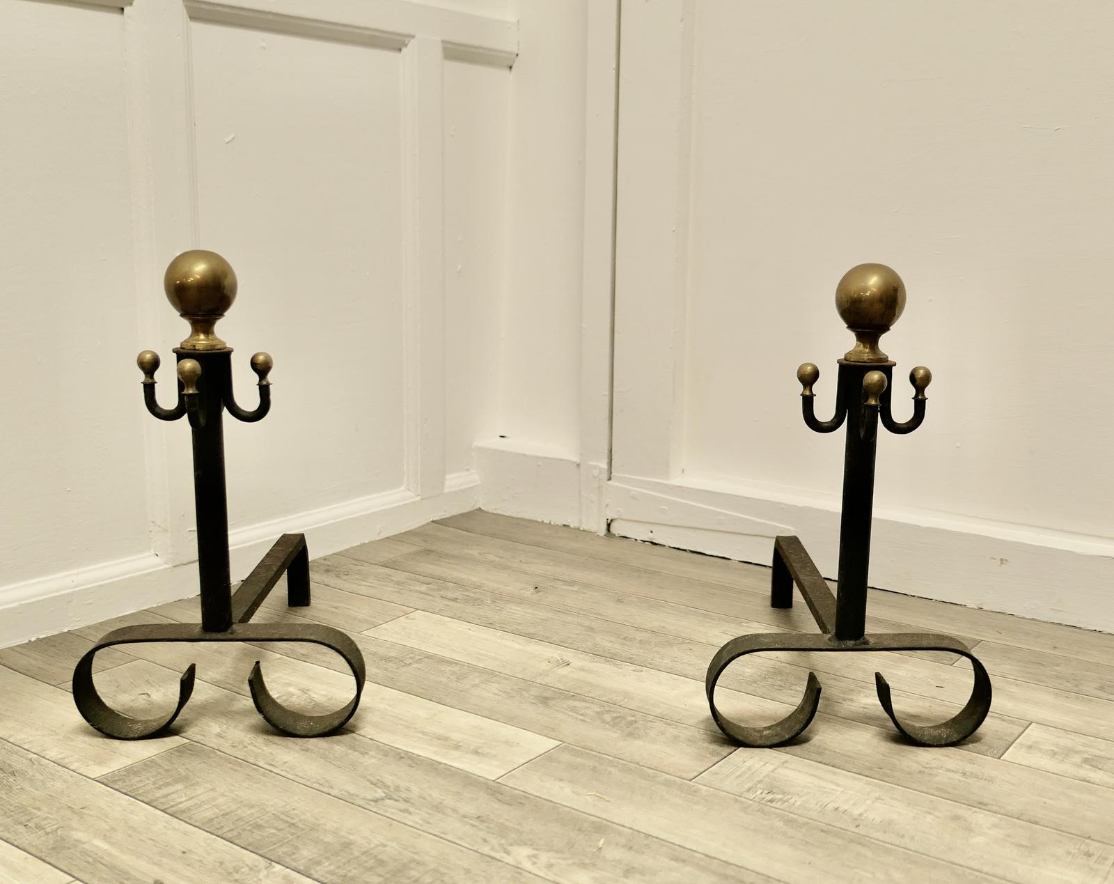 Pair of 19th Century Brass & Iron Andirons or Fire Dogs