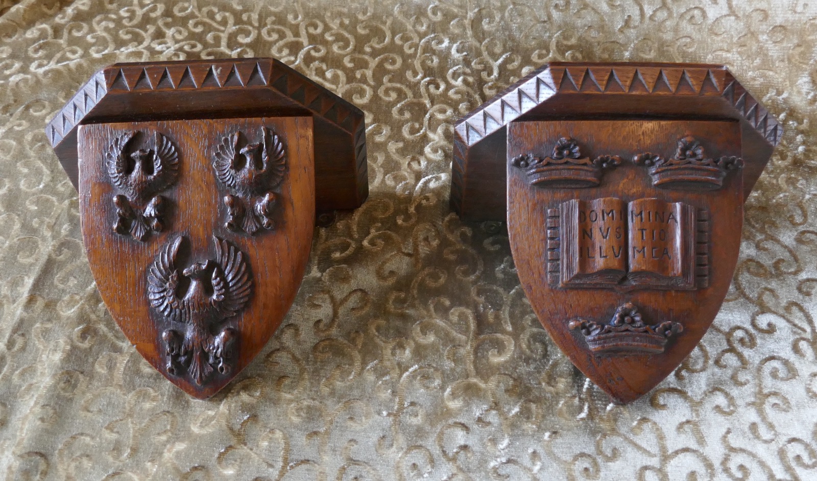 Pair of 19th Century Carved Oak Wall Brackets, Armorial Crests