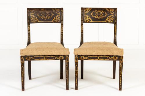 Pair of 19th Century English Regency Gilt Decorated Chairs These interesting chairs have a simulated rosewood painted finish, topped with lovely gilt painted designs. The backs decorated with cartouches and the uprights having designs which include stylised anthemions and harebells. The legs and three sides of the apron are also decorated with gilt designs. The uprights flow in to a raised section surrounding seats. The legs are of sabre form, a design classic from this period.
