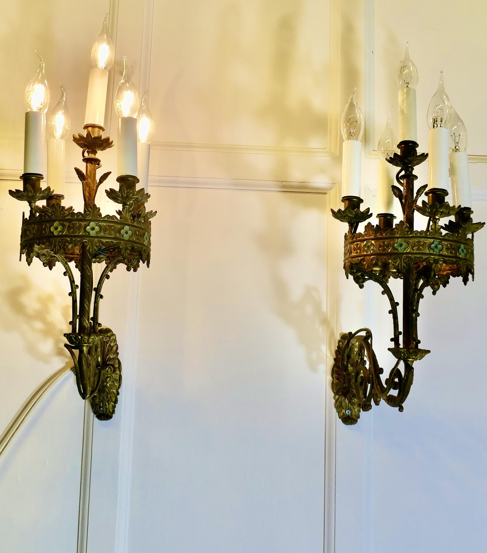 Pair of 19th Century French Brass & Enamel 5 Candle Wall Sconces