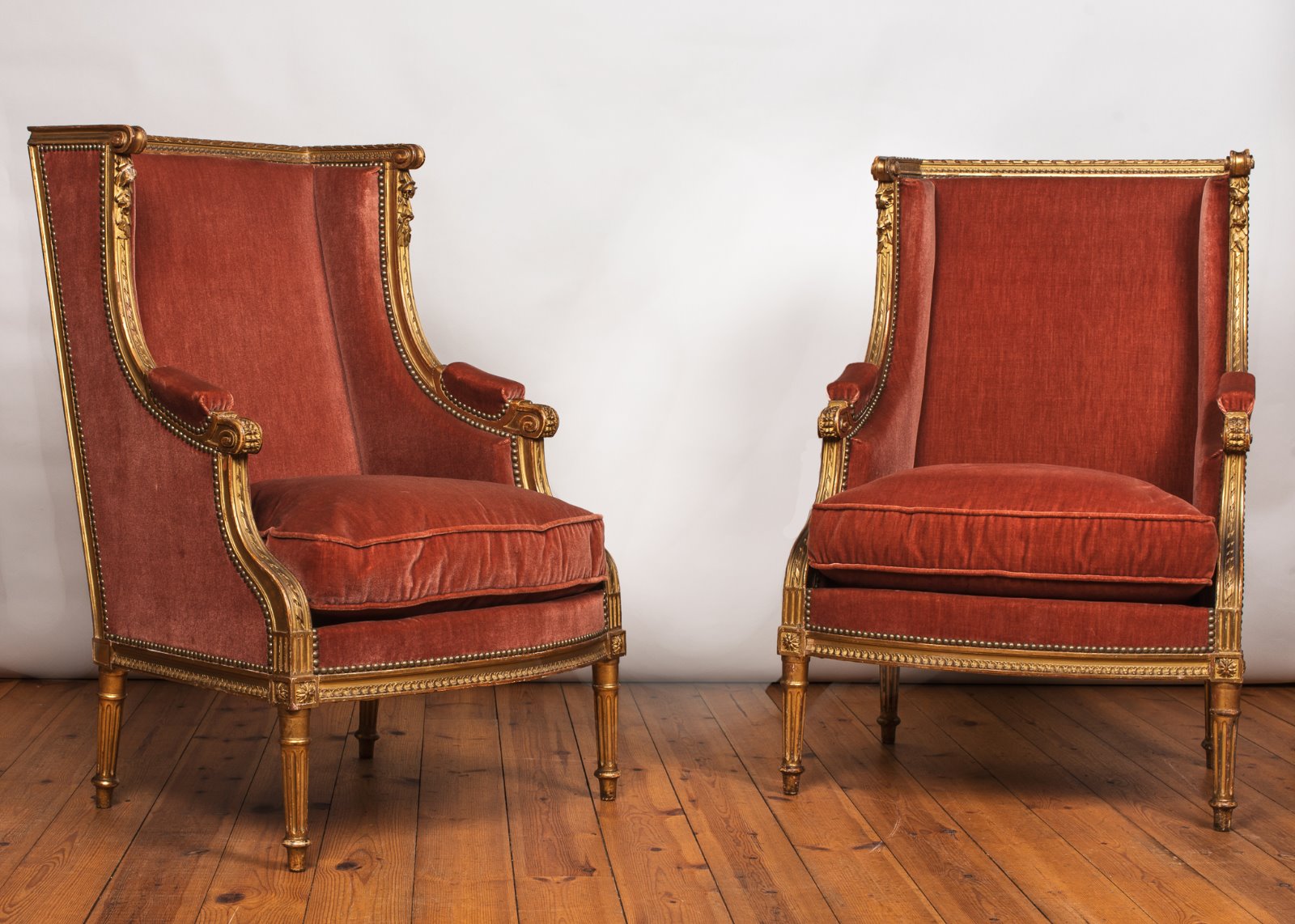 Pair of 19th Century French Gilded Louis XVI Style Upholstered Bergeres (1 of 1)