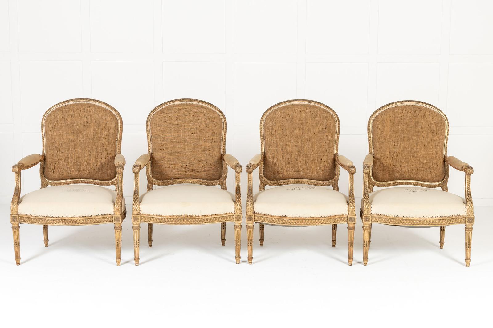 These armchairs are gilded throughout and stand on turned and carved legs with toupie feet. The show frame on the back and the front seat rails are both carved with a repeating guilloche design, the legs are fluted and have additional leaf carving where they join the front rail. There are also carved floral paterae on the blocks at this point.
