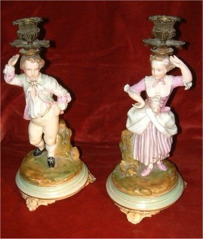 Pair of 19th Century French Porcelain Candlesticks with Bronze Scones