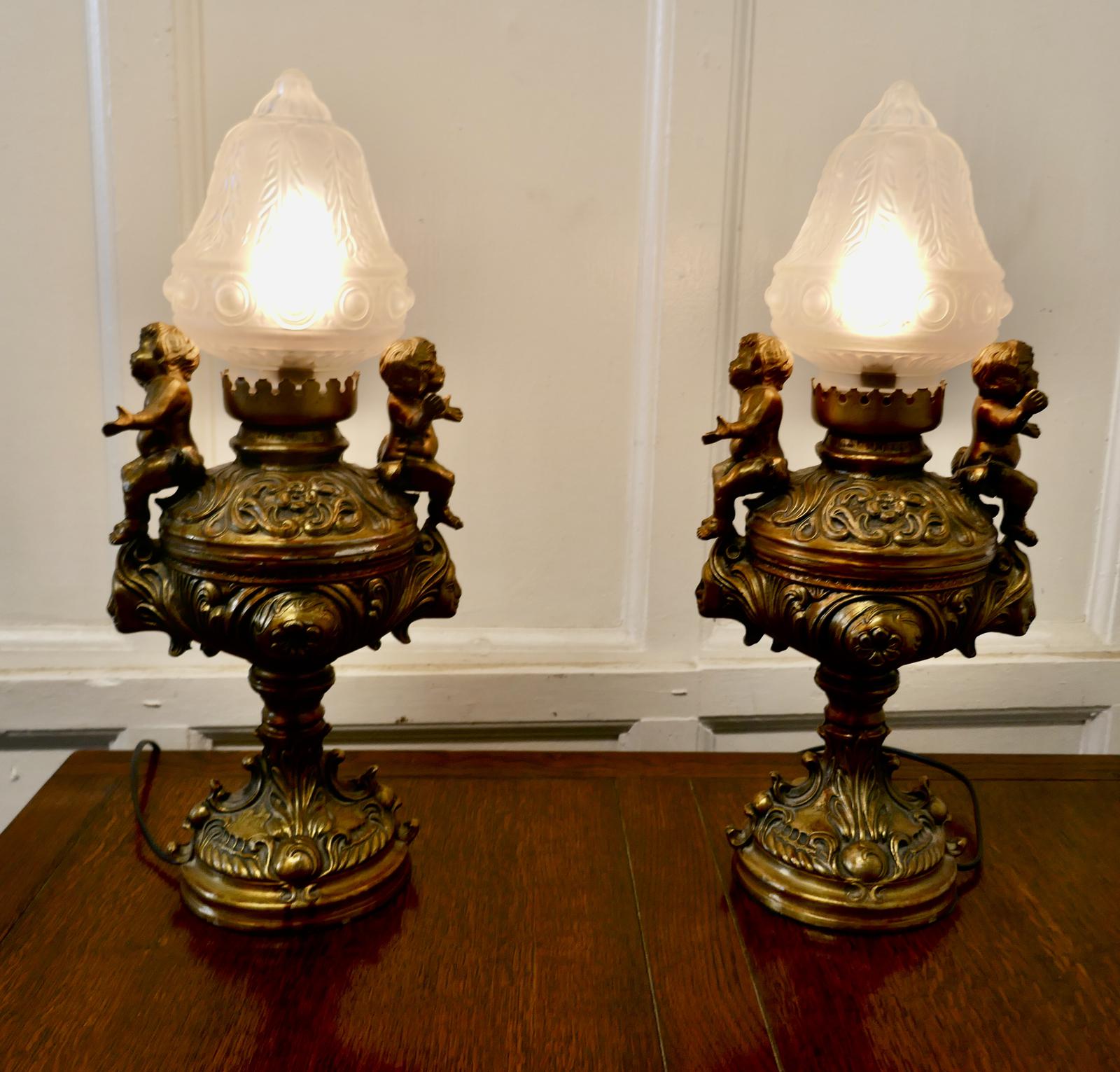 Pair of 19th Century Gilt Lamps in the Form of Cherubs or Putti