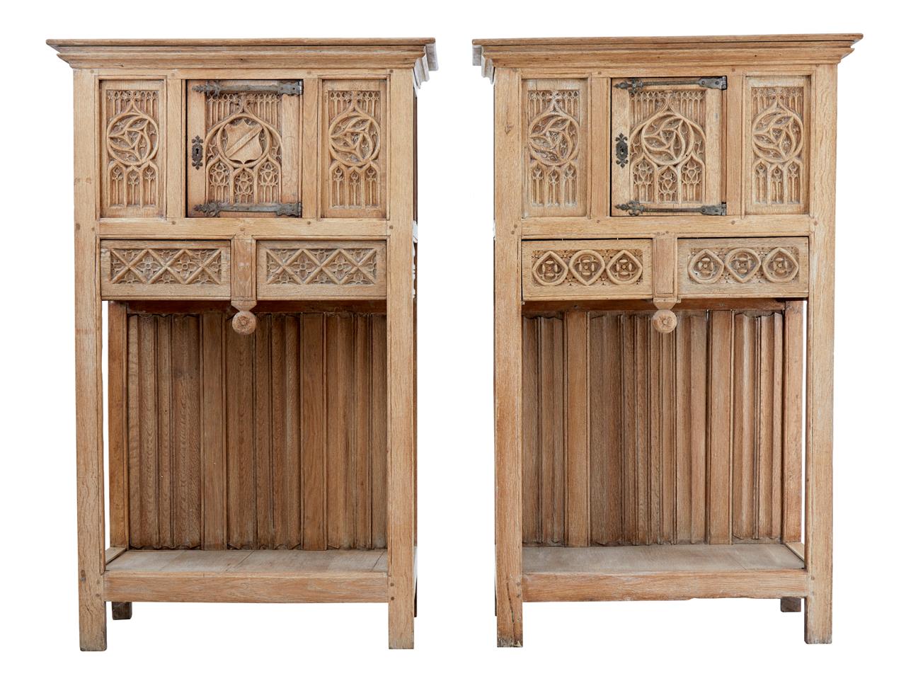 Pair of 19th Century Gothic Revival Carved Oak Cabinet on Stands
