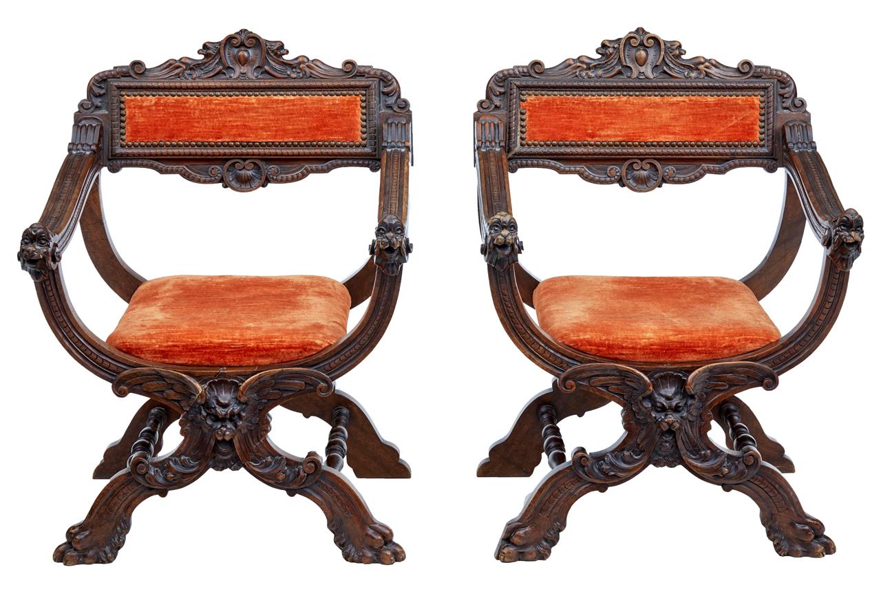 Pair of 19th Century Italian Carved Walnut Savonarola Chairs