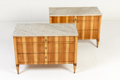Pair of 19th Century Italian Fruitwood Chest of Drawers A Pair of Early 19th Century Italian Fruitwood Chest of Drawers with Marble Tops. A striking pair of chests veneered to create a geometric repeating striped pattern on the front and both sides. These commodes have something of a contemporary feel to them despite being early 19th century in date. They have white and grey veined marble tops. Standing on tapering toupee feet. There are simple escutcheon plates in the drawers which allow the key to be used to open them. Each chest has one narrow drawer and two wider ones below. The sides are panelled. H 90cm x W 125cm x D 59.5cm H 35½” x W 49¼” x D 23½”