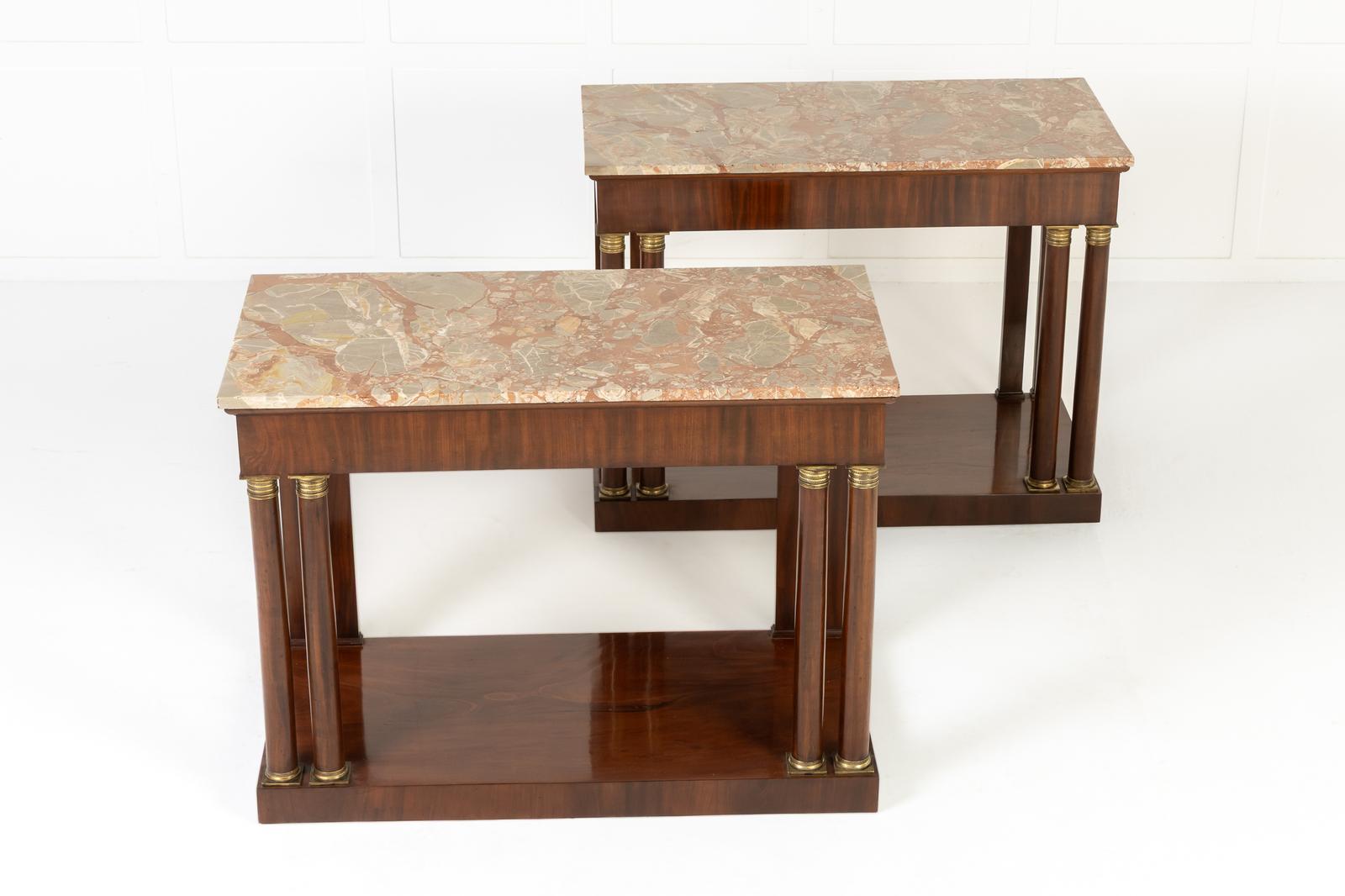 A Pair of 19th Century Italian Mahogany Console Tables with Original Marble Tops.