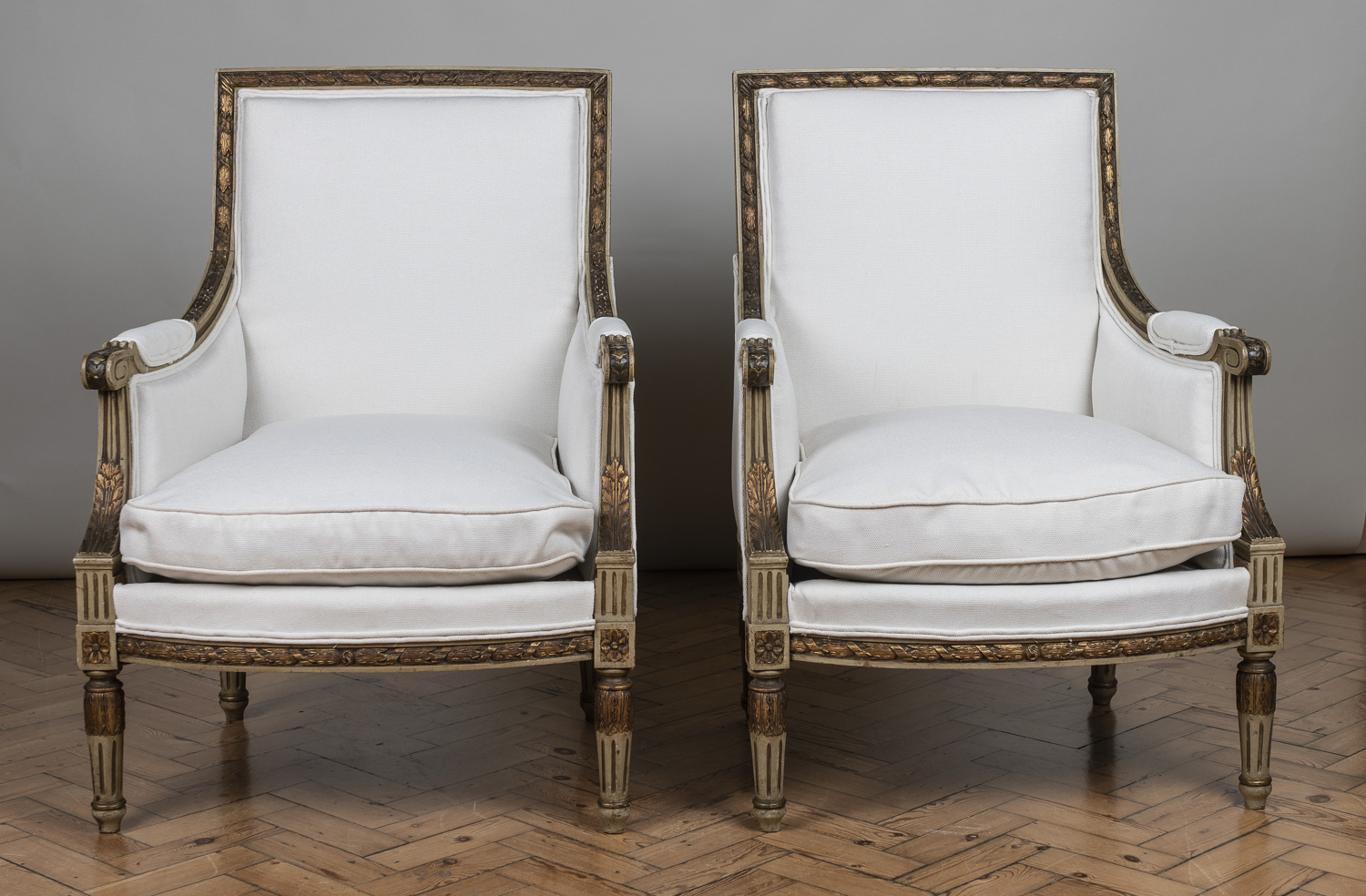 Pair of 19th Century Large French Painted & Gilt Bergere Armchairs