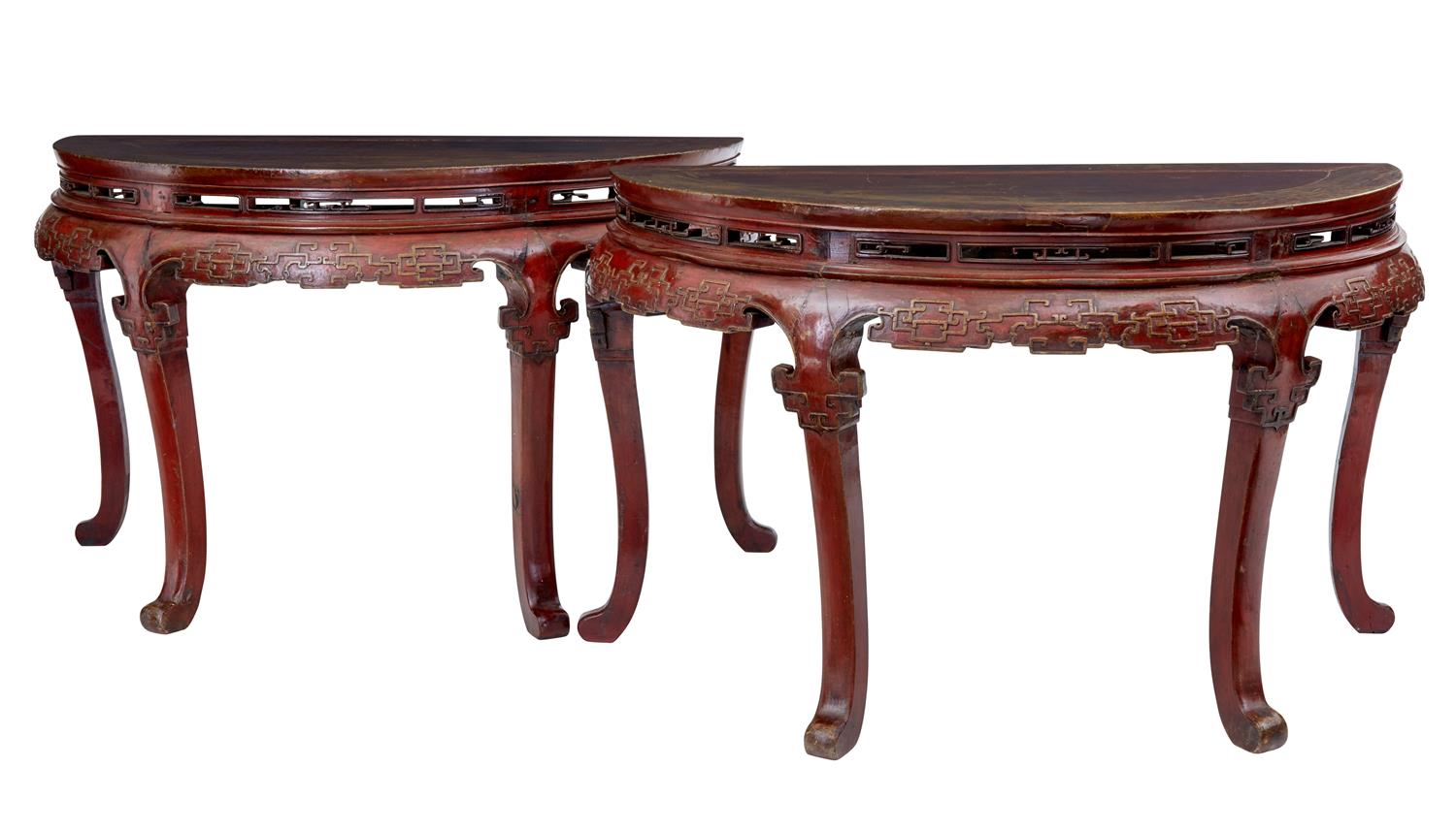Pair of 19th Century Red Lacquer Chinese Demi Lune Tables (1 of 7)