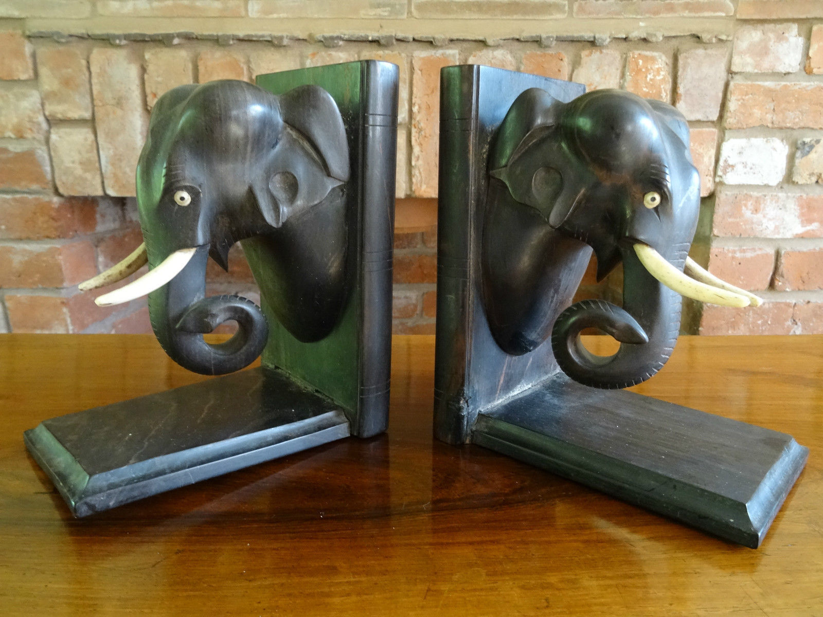 Pair of 19th Century Victorian Antique Indian Carved Elephant Library Book Bookends