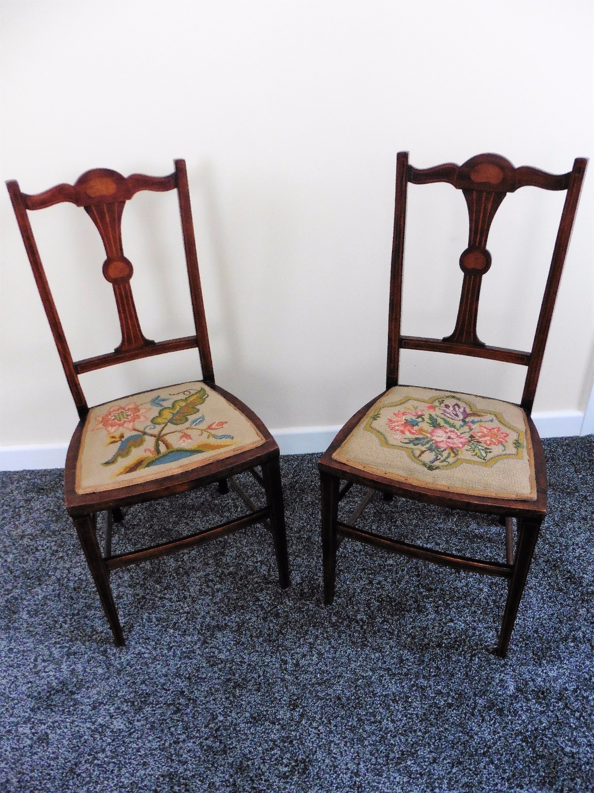 Pair of 2 Lovely Rosewood Inlaid Petit Point Embroiderd Bedroom Salon Side Chairs
