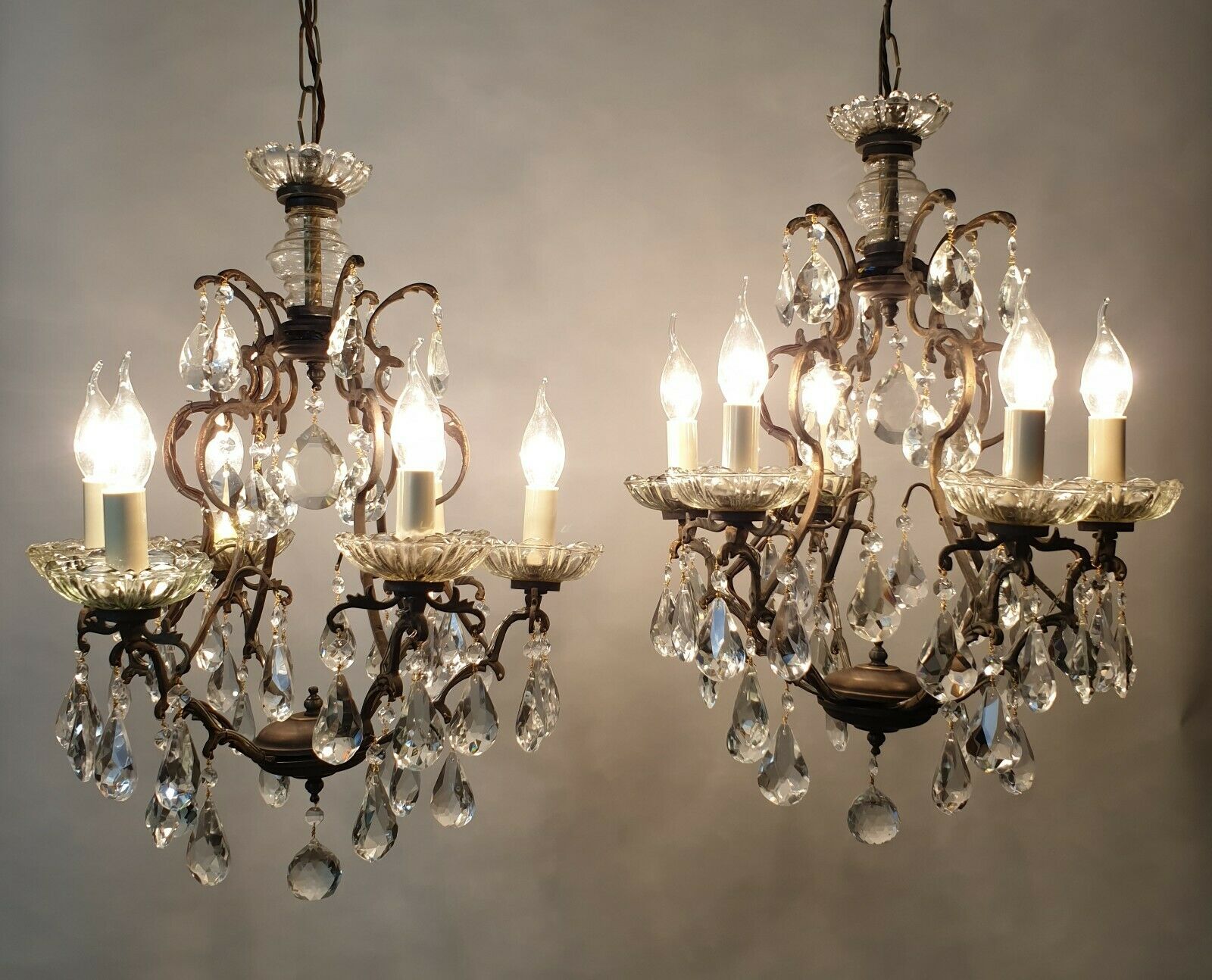 Pair of 6 Arm Crystal & Aged Brass Chandeliers, Rewired C.1910