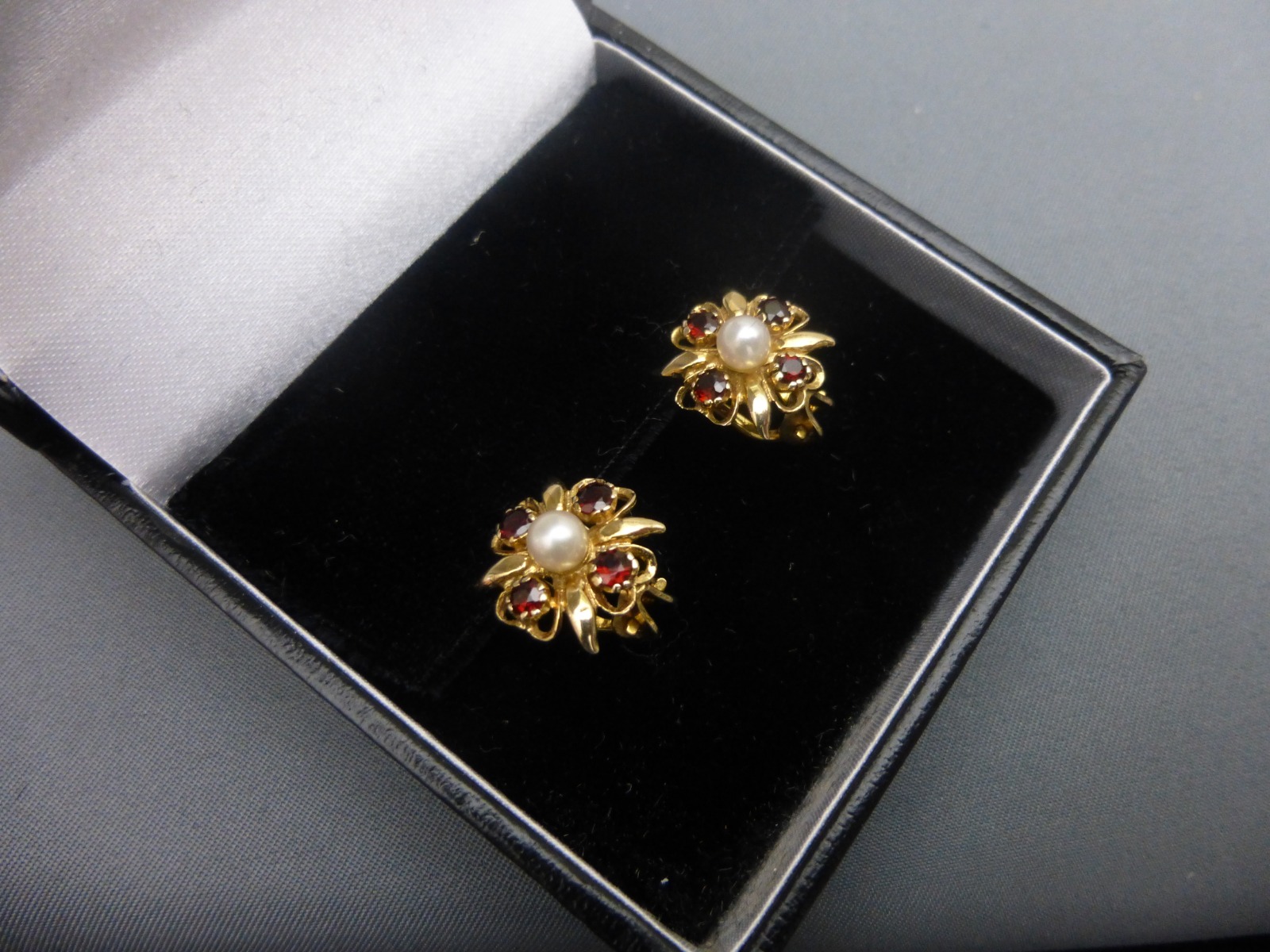 Pair of 9ct Gold, Garnet & Pearls Clip Earrings