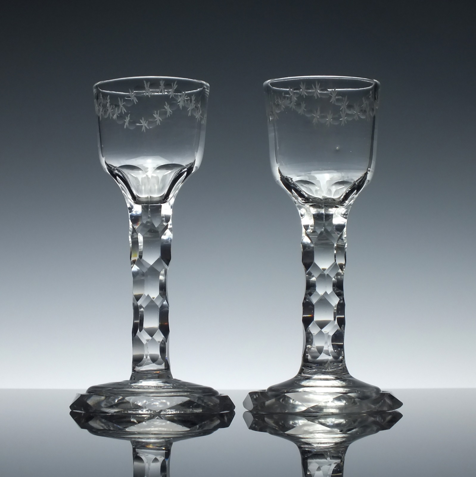 Pair of Antique 18th Century Georgian Facet Wine Glasses with Octagonal Feet c.1795