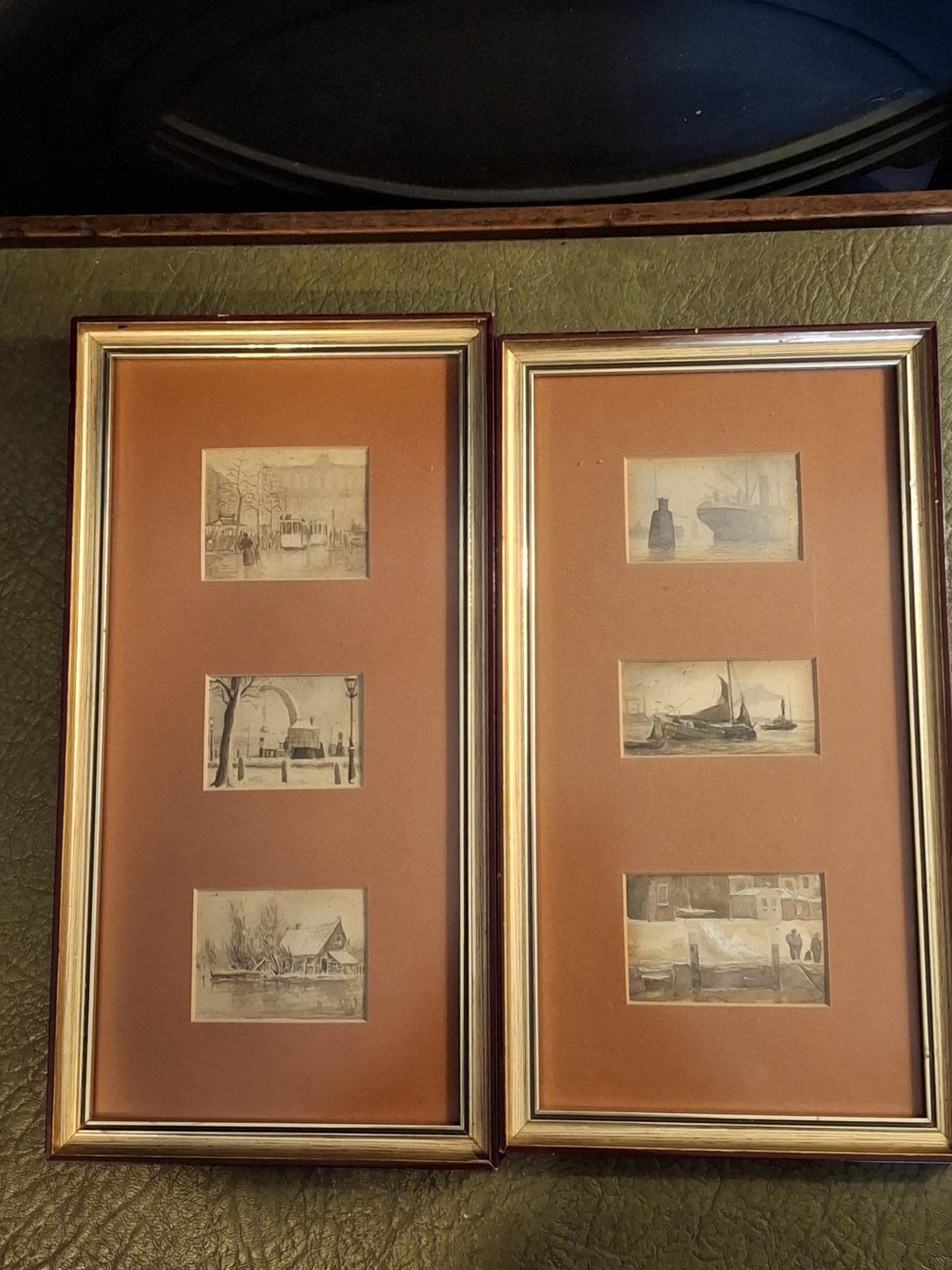 This is a pair of antique miniature watercolour pictures created between 1900 and 1920. Each picture features 3 miniature watercolours painted on cigarette cards by Ave Van Bensdorp they are beautifully painted and have a very small amount of foxing, unusual and interesting works of early 20th century art they measure