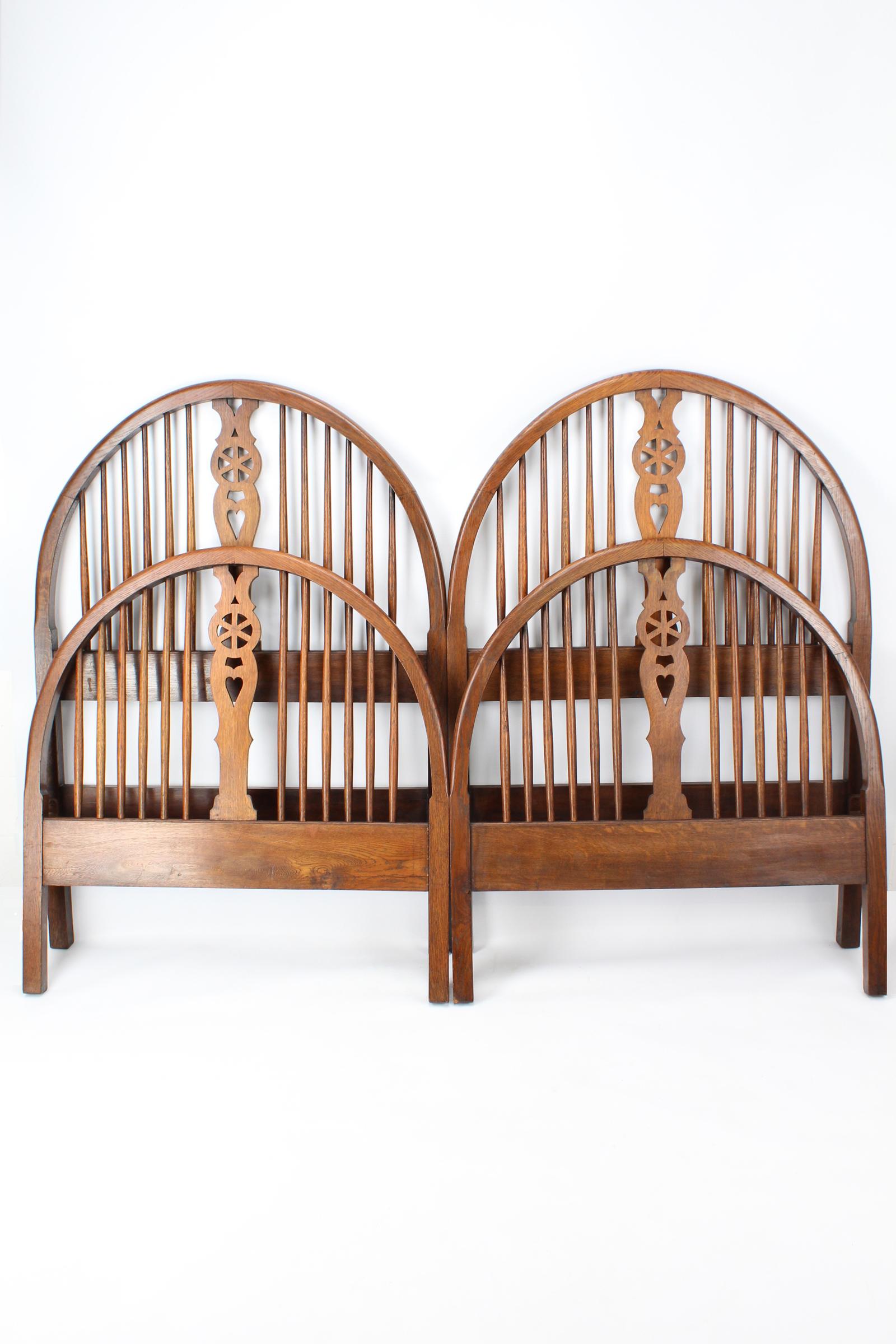 A beautiful pair of 1920s oak single beds attributed to Heals of London. with distinctive cart-wheel backs complete with spindles and pierced central splats echoing the designs of country chairs. The central splats with classic “love heart motifs” of Arts & Crafts furniture. Features a headboard, footboard and two side irons. (no mattress or bed base included).