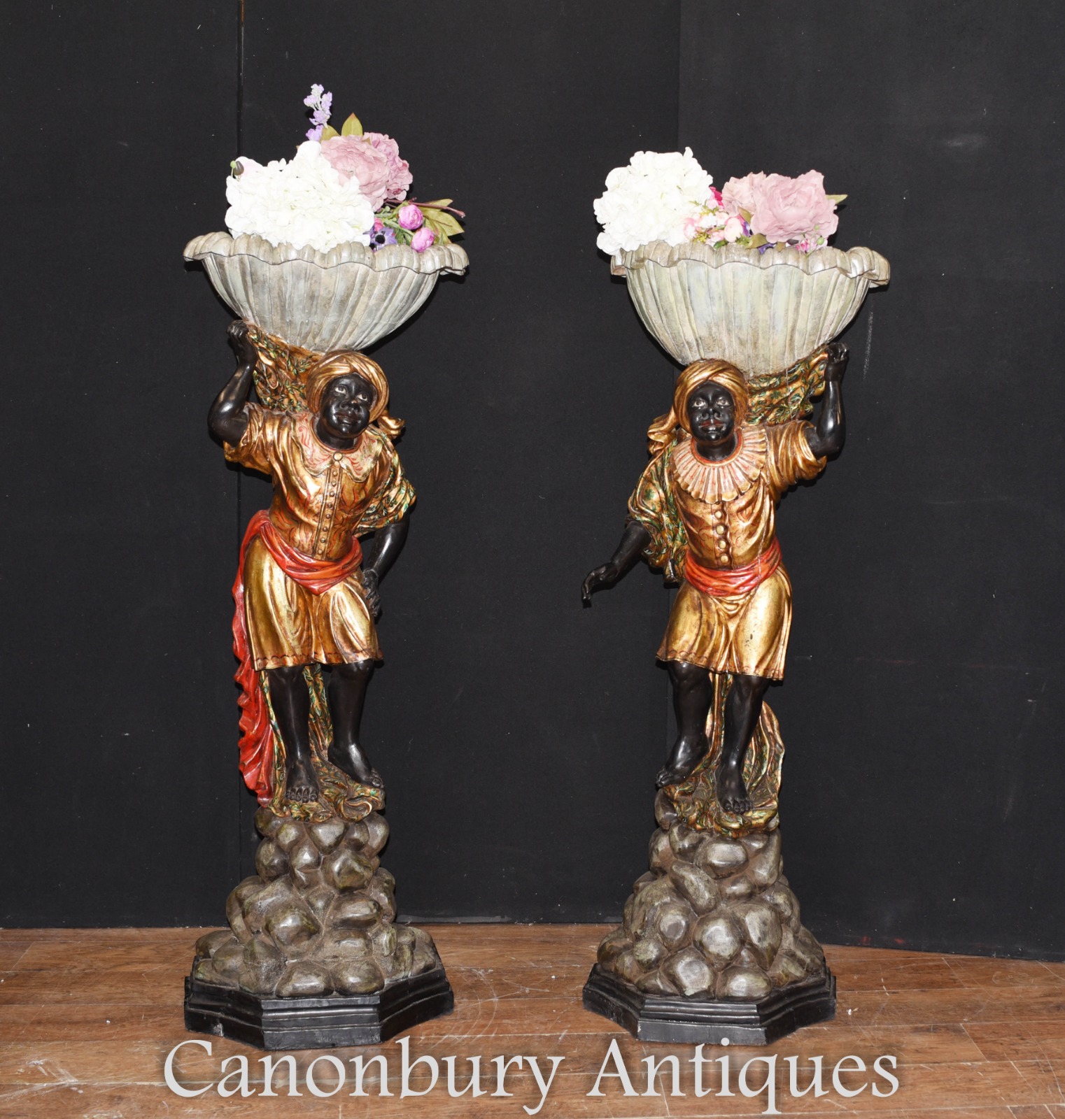 Pair of Antique Blackamoor Figurines Clam Shell Planter Stands