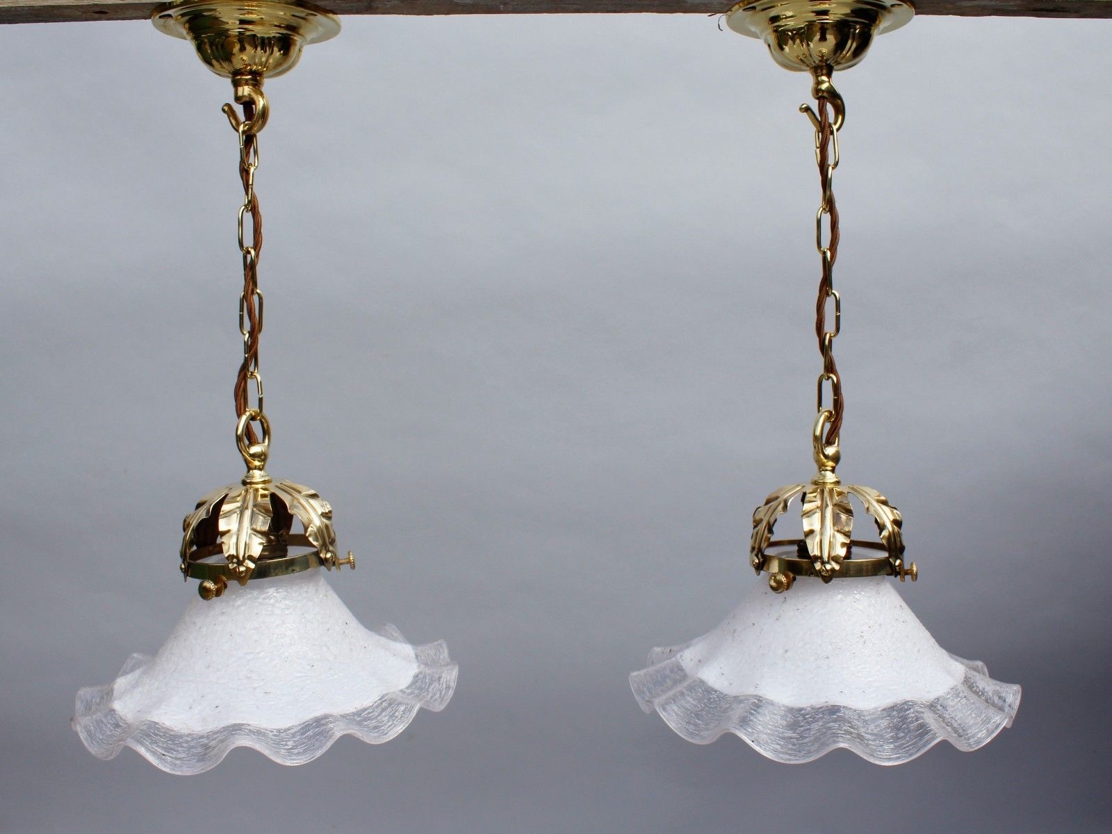 Pair of Antique Brass Hanging Lights with Glass Shades (1 of 7)