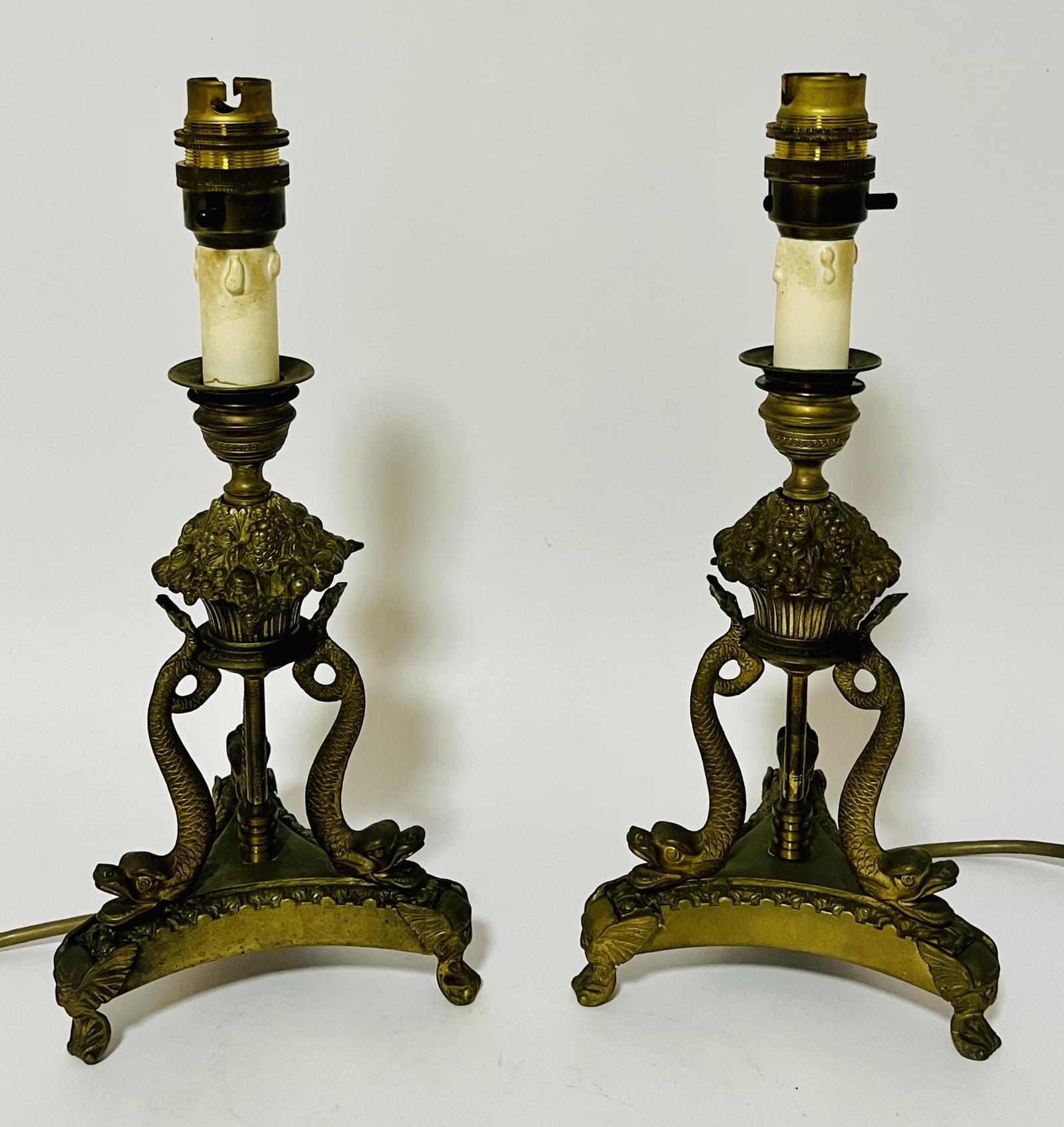 A good quality pair of brass table lamps dating from the early 20th century. They are designed in the Neoclassical style with ornate dolphin figures forming the base supports, winged feet on the triform base and an elaborate basket of fruit on the top. Above this sits the candle sconce with faux candle supporting the bulb holder. They are good quality pieces with lots of detail, good casting and a good weight. They are in working order and have been PAT Tested for electrical safety. They are in good condition and display well. There are some minor marks and general signs of age use but nothing detrimental. The surface has tarnished over time and has only been lightly cleaned to preserve its patination. The best description comes from the photos so please look at them all carefully and if you have any questions just ask. Tracked UK Delivery £12