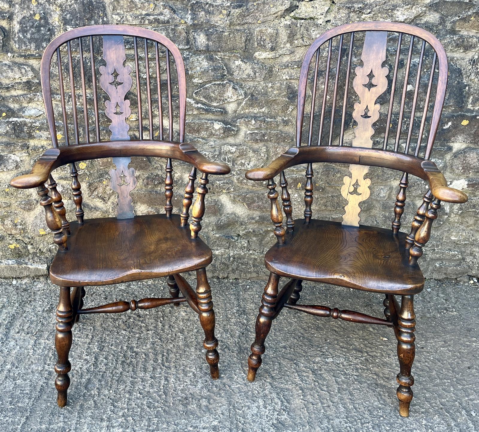 A good example of a pair of Broad Arm Windsor chairs dating from the mid to late 19th century. They are made from ash and elm and both have a high hooped back enclosing turned spindles with a pierced back splat. They stand on turned legs joined by a H-stretcher.