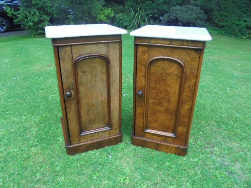 Pair of Antique Burr Walnut Marble Topped Bedside Cabinets / Bedside Tables c.1860
