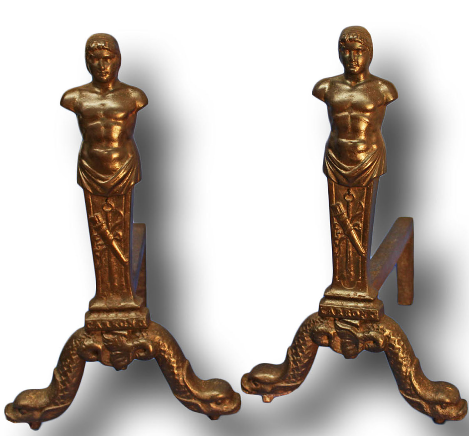 Pair of Antique Cast Iron Firedogs or Andirons - Roman Figures