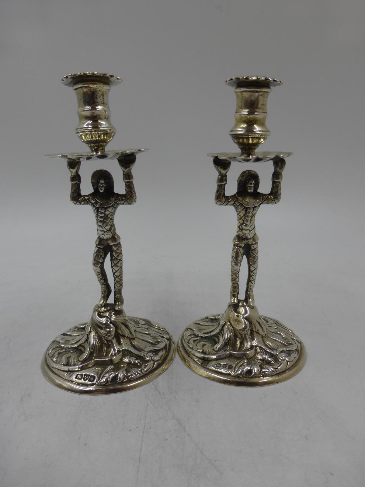 Pair of Antique Cast Silver Harlequin Tapersticks / Candlesticks Chester 1907