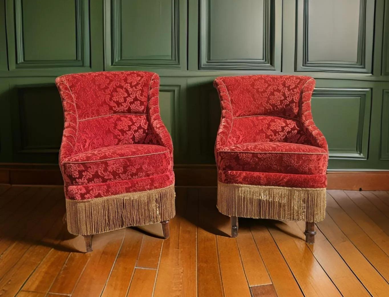 Pair of Antique Chairs in Rich Red Damask Wool Moquette with Long Tassels (1 of 12)