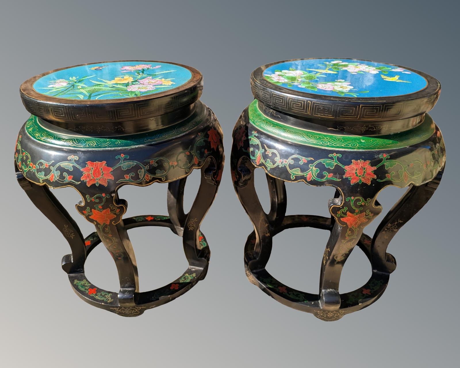 Pair of Antique Chinese Lacquer & Cloisonné Stools Side Tables