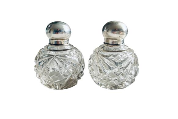Pair of Antique Clear Cut Glass Perfume Scent Bottles with Sterling Silver Lid c.1890