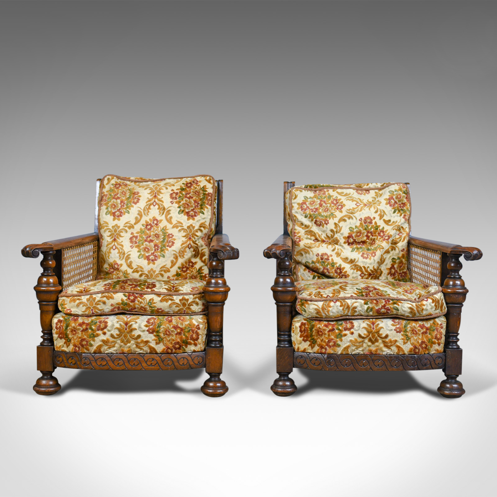 Pair of Antique, Conservatory Chairs, Oak, English, Bergere Armchairs c.1910