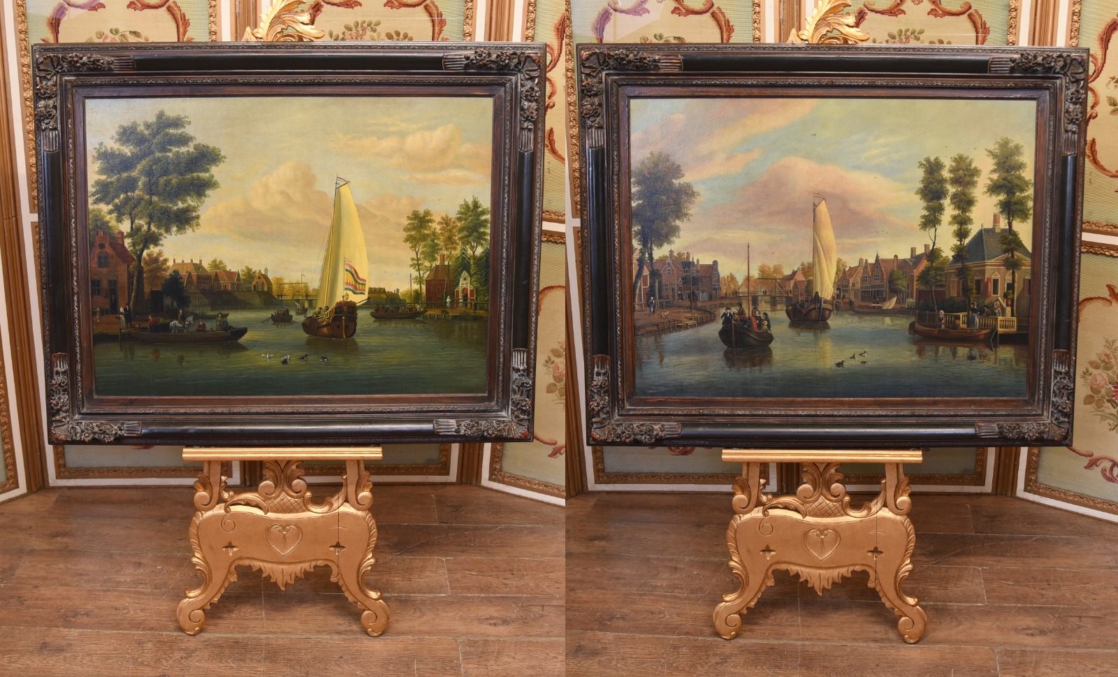 Pair of Antique Dutch Oil Paintings Boat Scenes Riverscape c.1860
