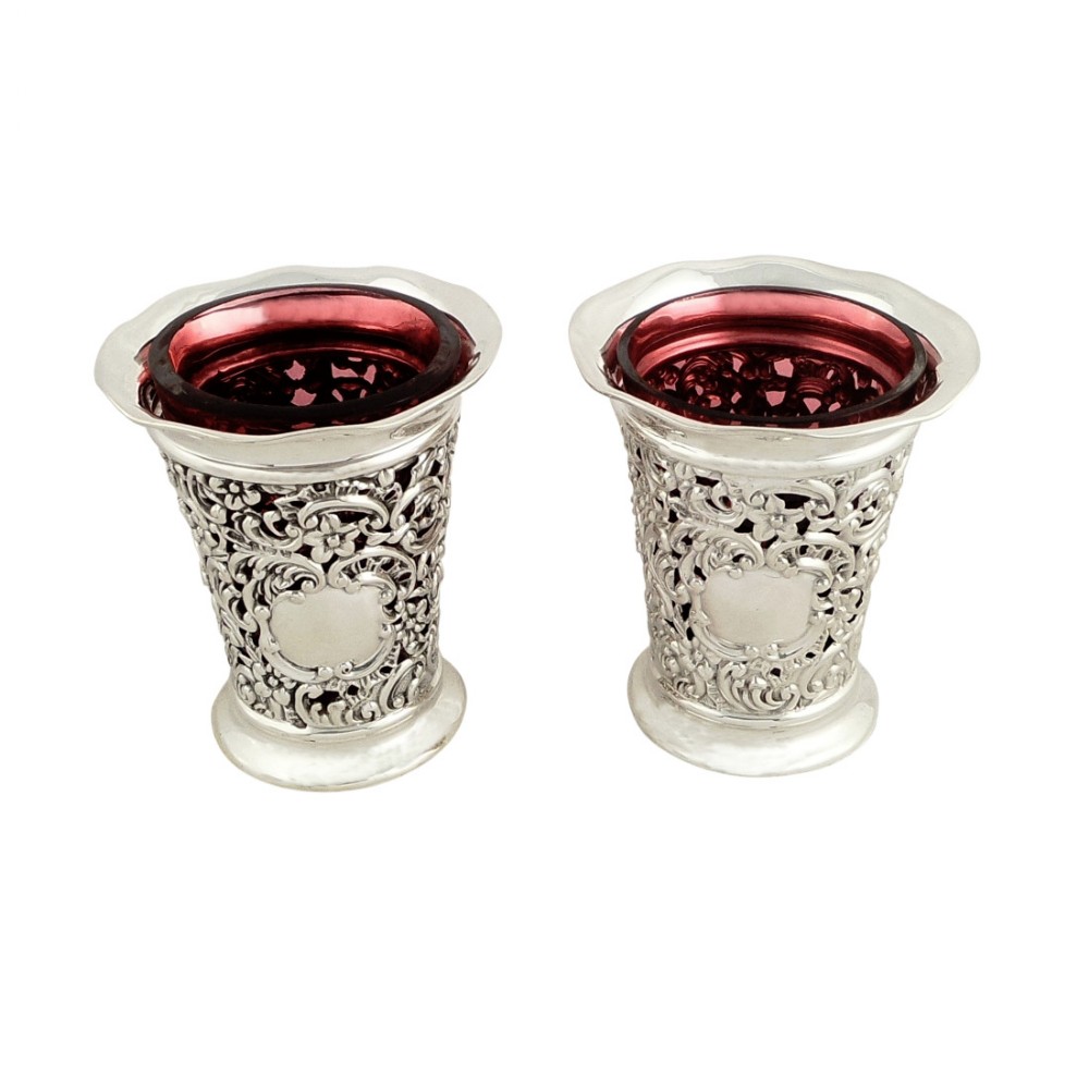 Pair of Antique Edwardian Silver Vases with Red Glass Liners 1902