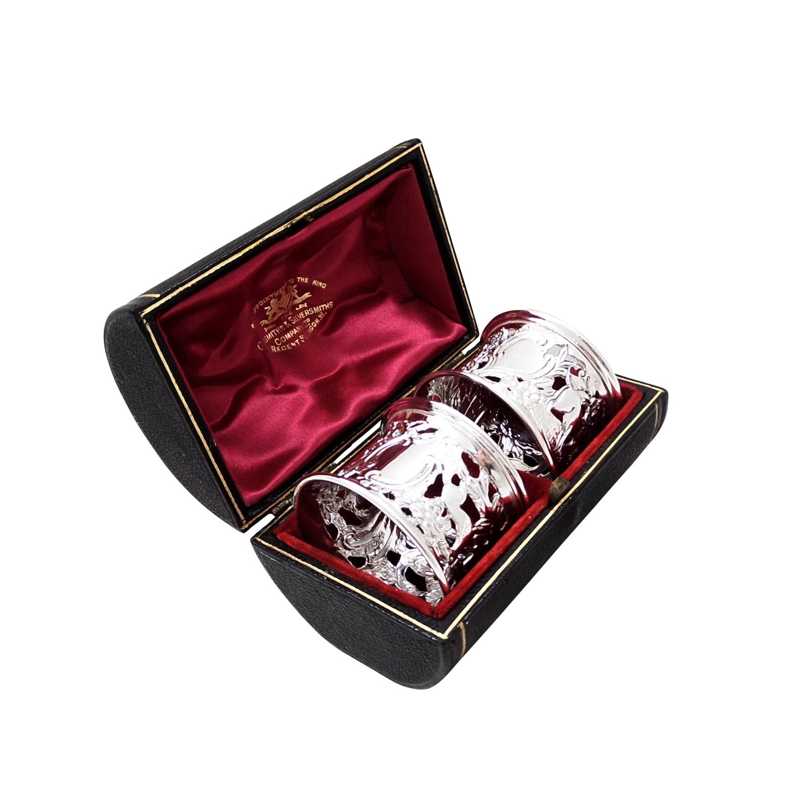 Pair of Antique Edwardian Sterling Silver 'Animals' Napkin Rings in Case 1902