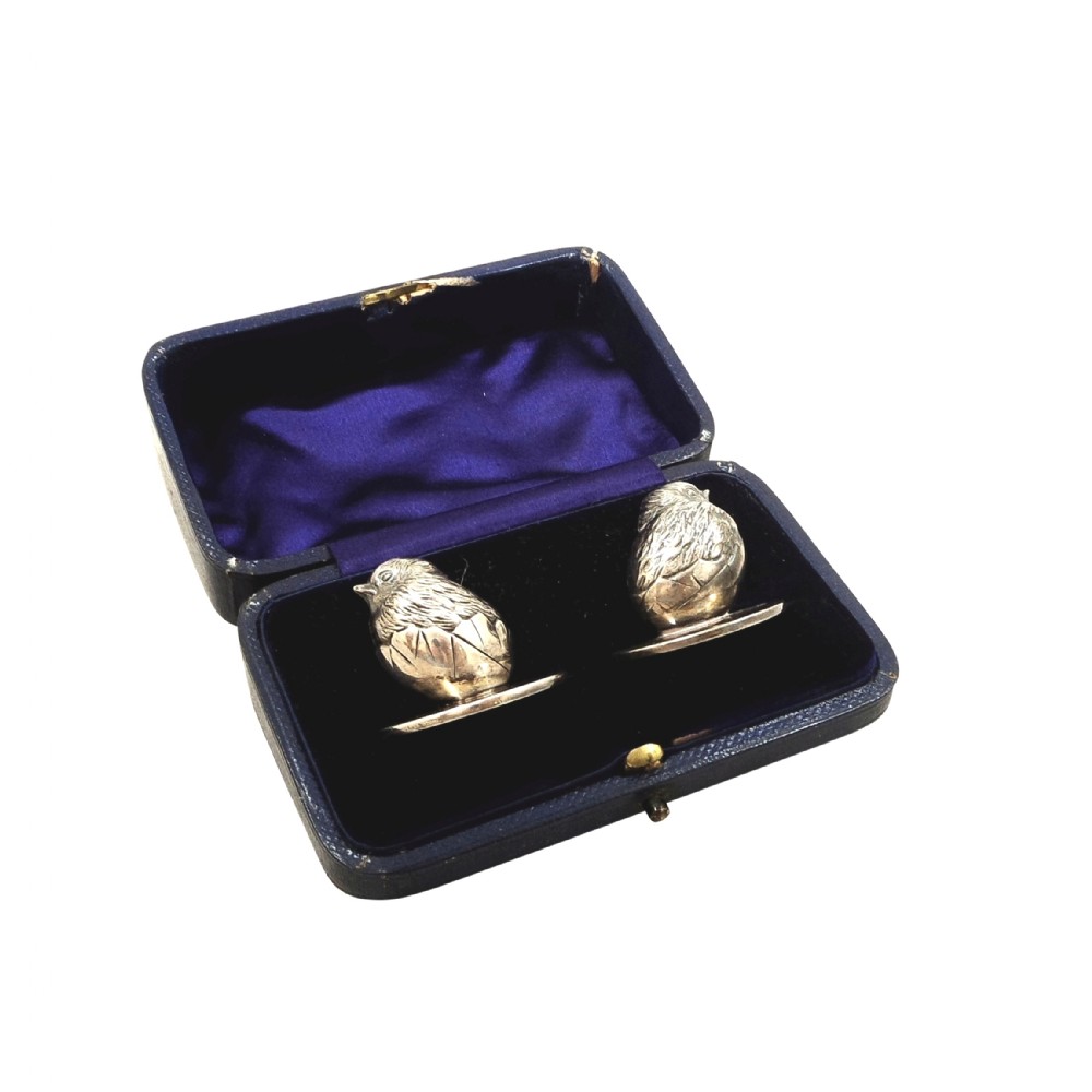 Pair of Antique Edwardian Sterling Silver Hatching Chick Menu Holders