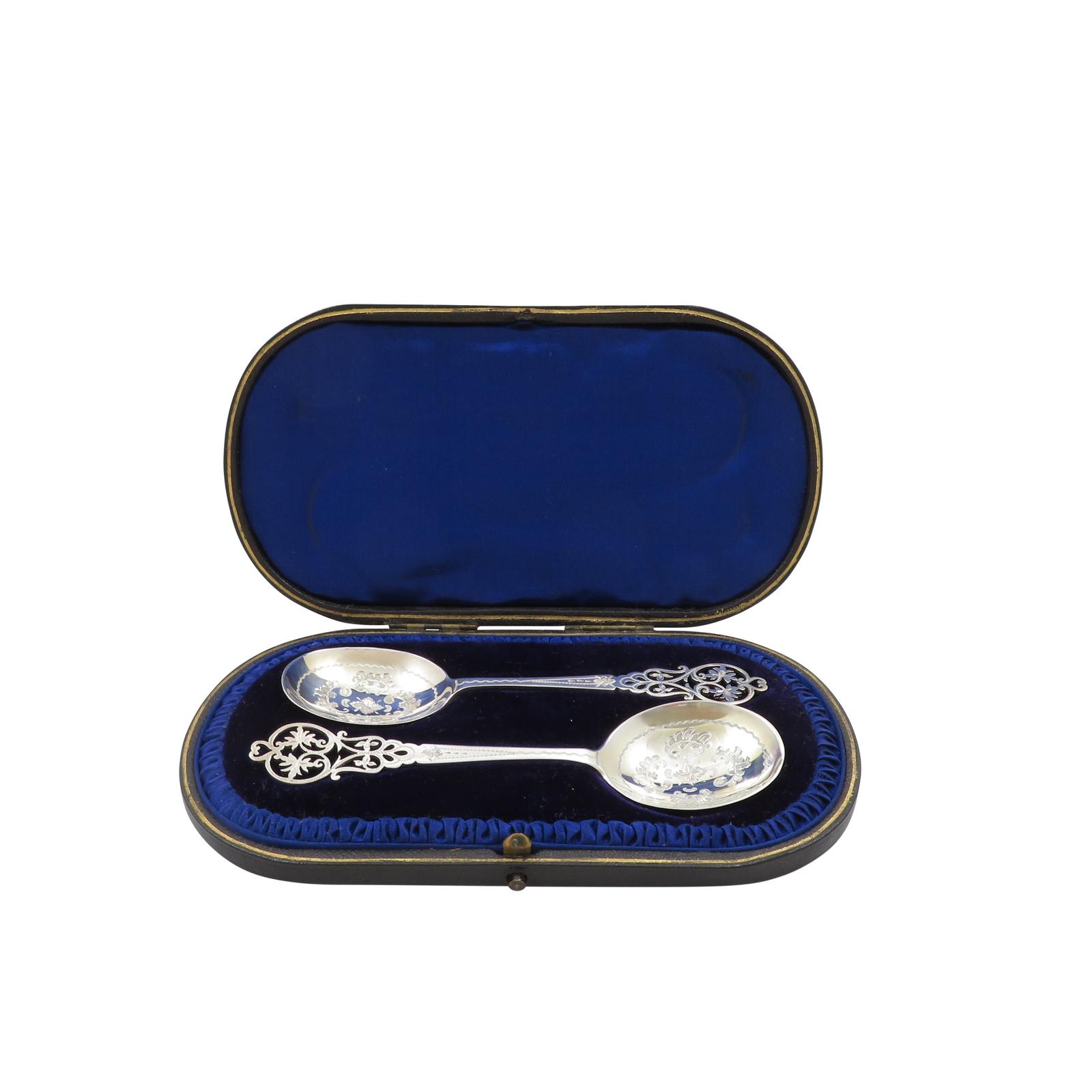 Pair of Antique Edwardian Sterling Silver Jam / Preserve Spoons in Case 1900/1904