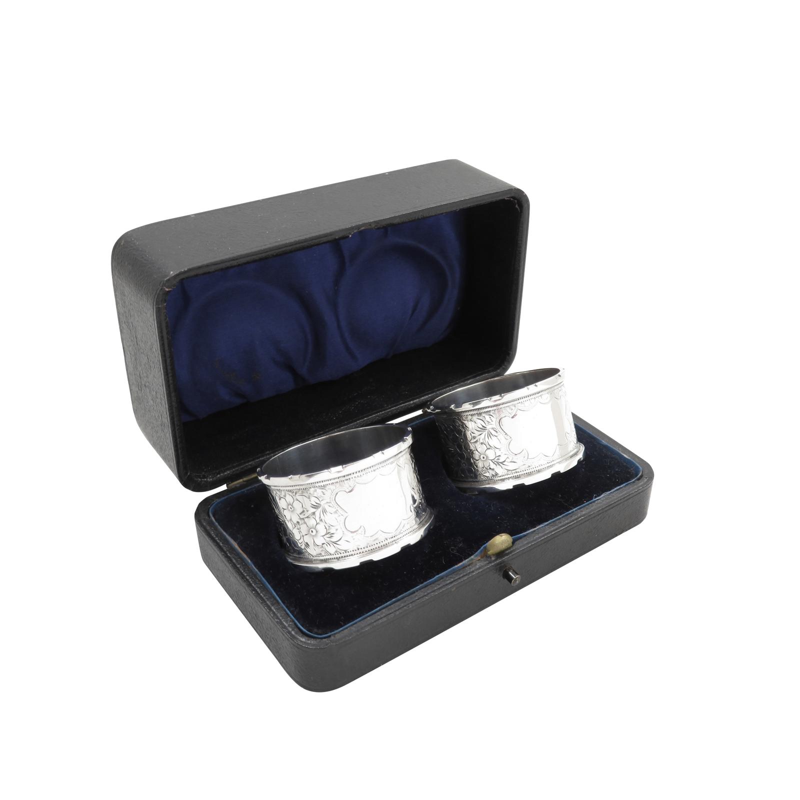 Pair of Antique Edwardian Sterling Silver Napkin Rings in Case 1907