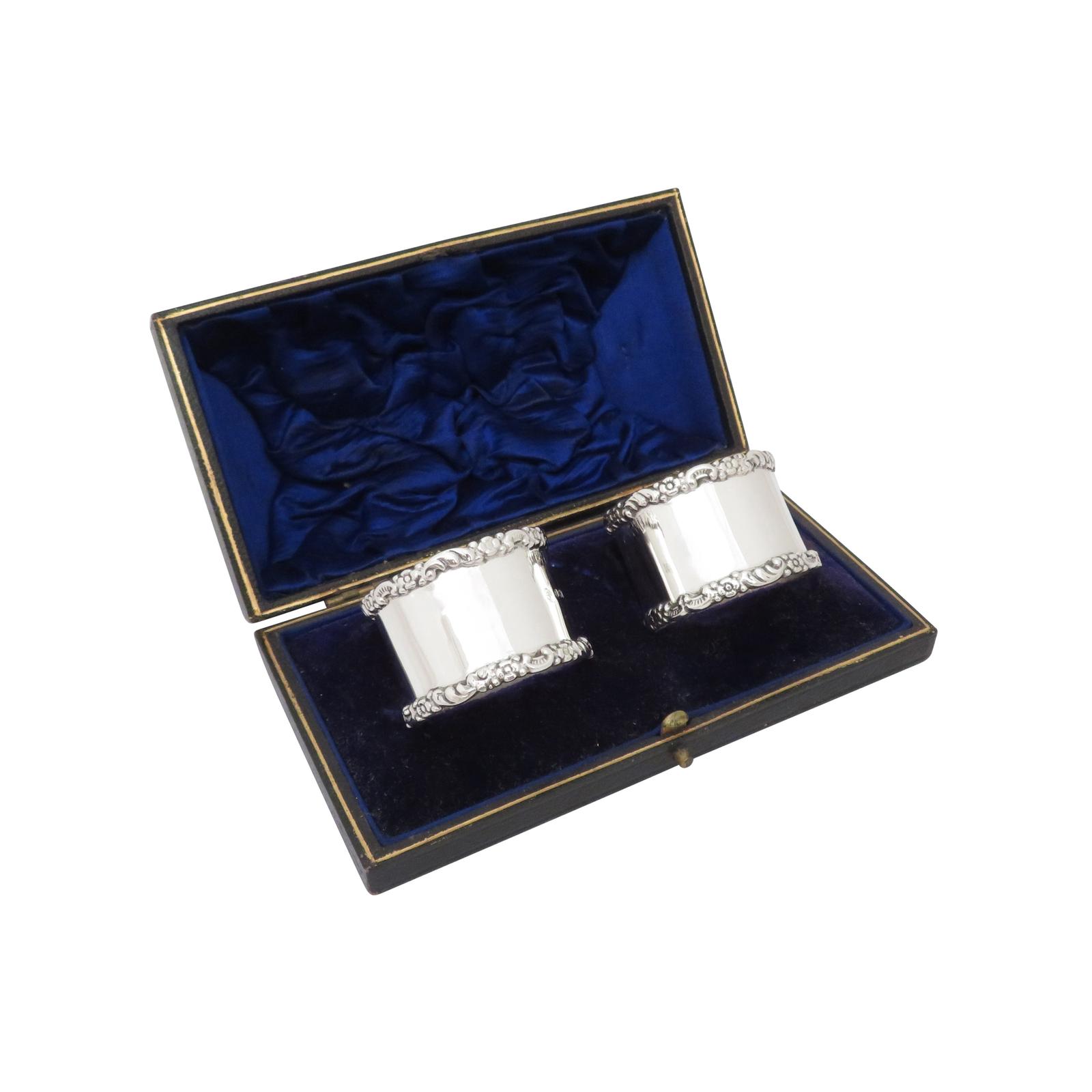 Pair of Antique Edwardian Sterling Silver Napkin Rings in Case 1910