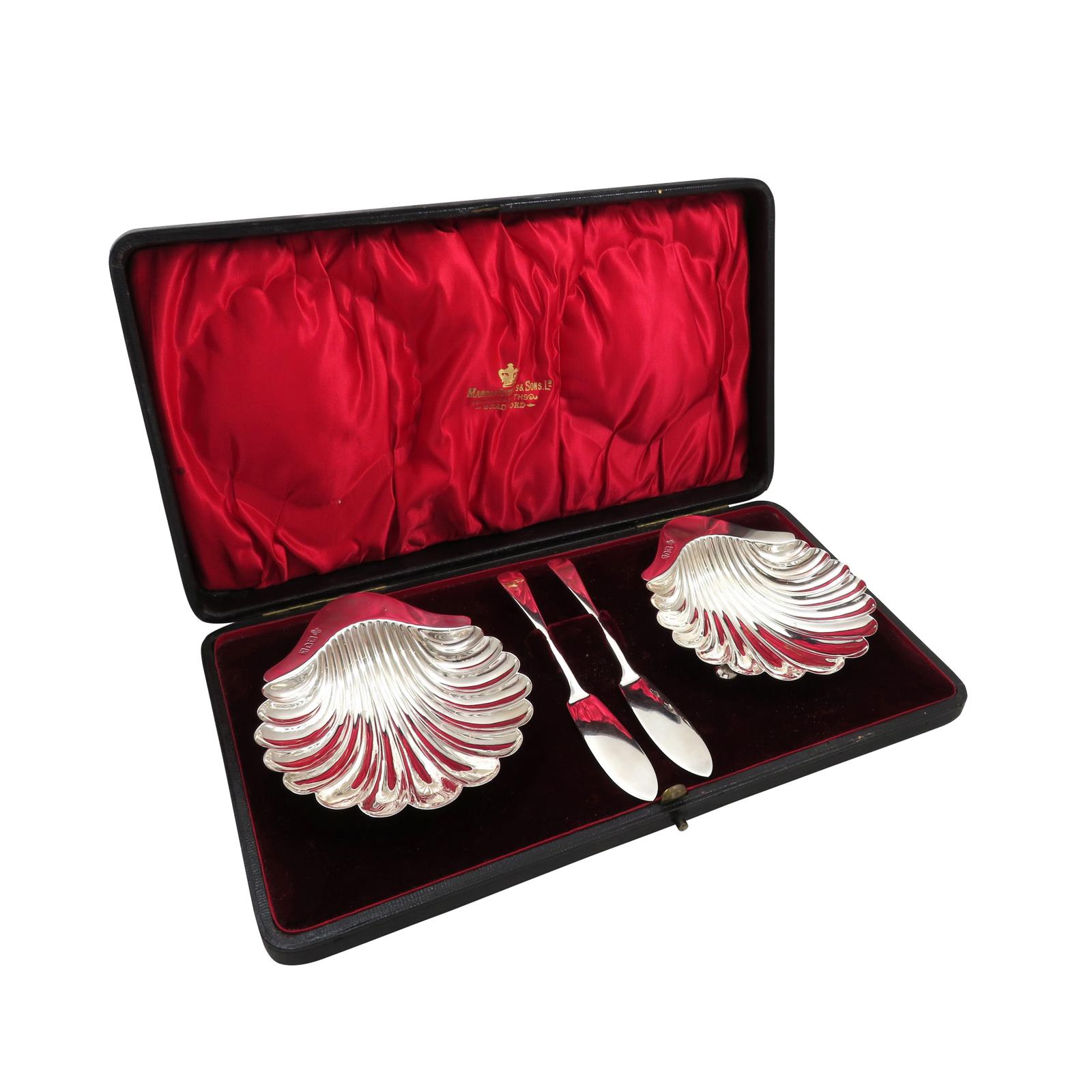 Pair of Antique Edwardian Sterling Silver Shell Dishes with Knives 1905