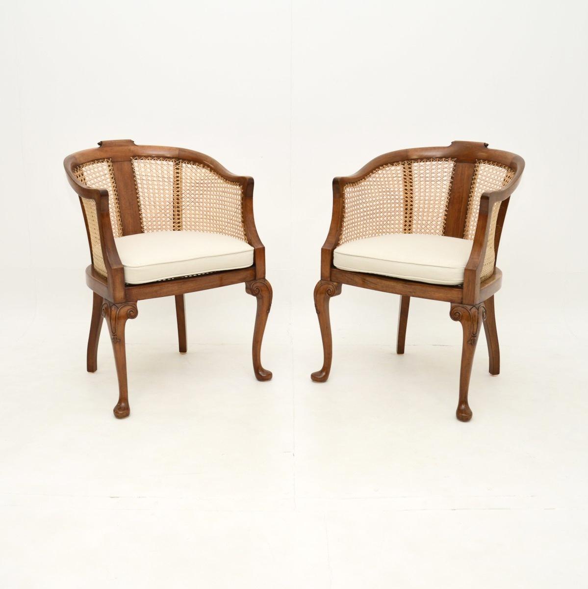 Pair of Antique Edwardian Walnut Cane Back Armchairs