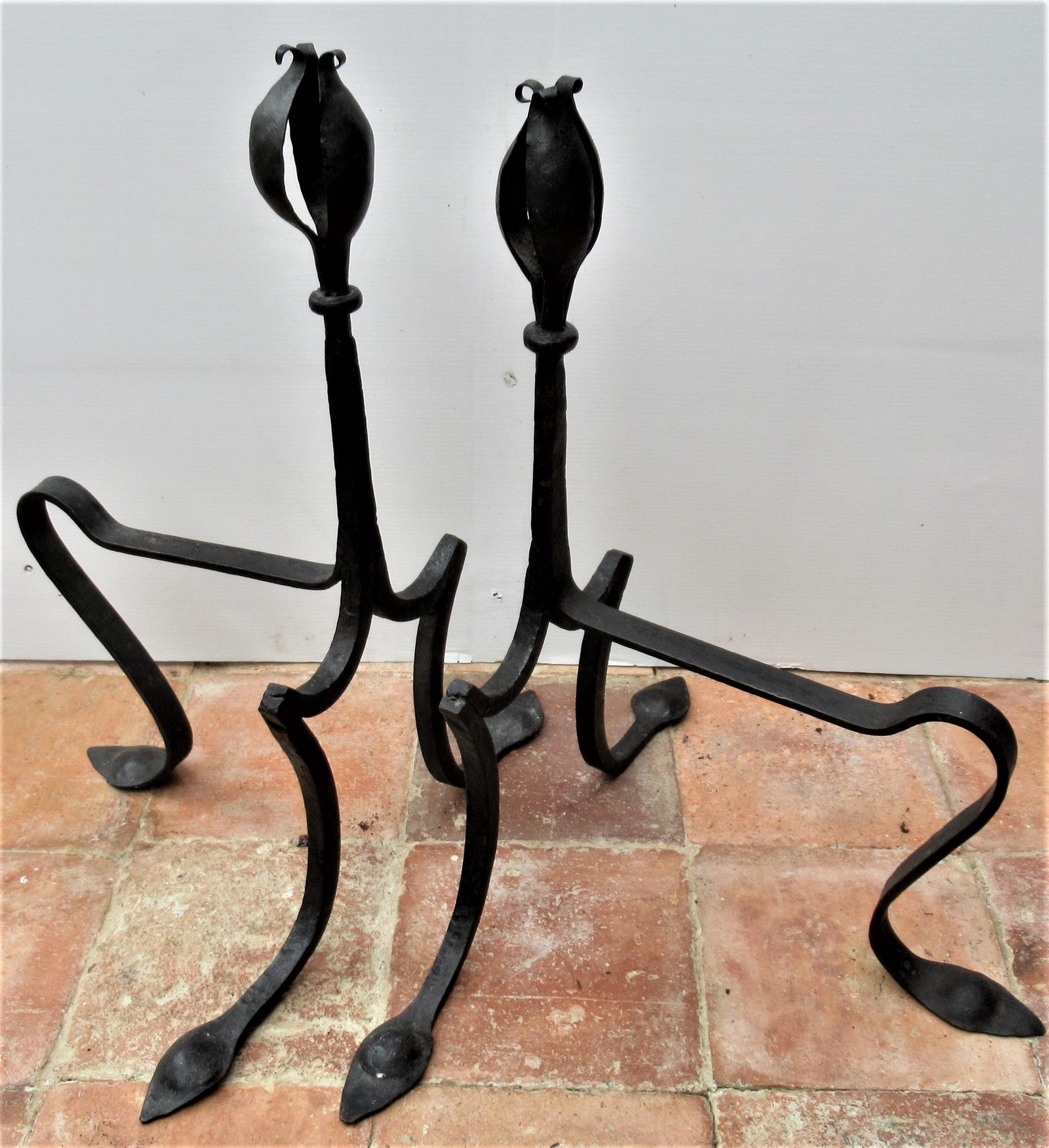 Pair of Antique English Arts & Crafts Wrought Iron Fire Dogs, Early 20th Century