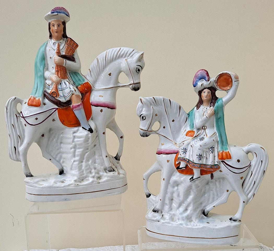 Pair of Antique English Victorian Staffordshire Figures ~ Mounted Scots Musicians
