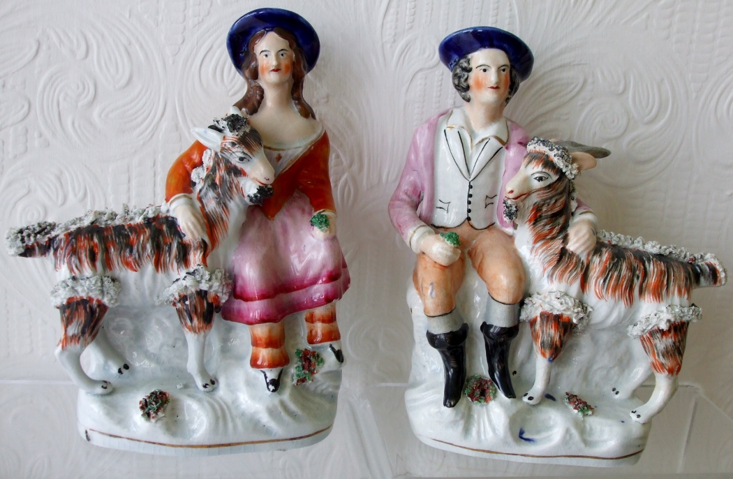 Pair of Antique English Victorian Staffordshire Pottery Figures "Boy & Girl with Goats" ~ H 2347A ~ H 2347B
