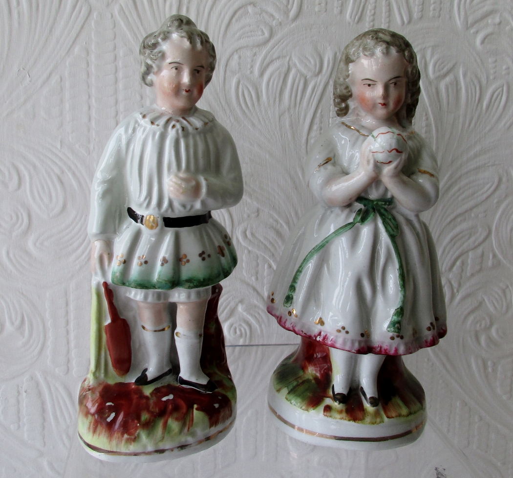 Pair of Antique English Victorian Staffordshire Pottery Figures ~ "Children At Play" C.1865