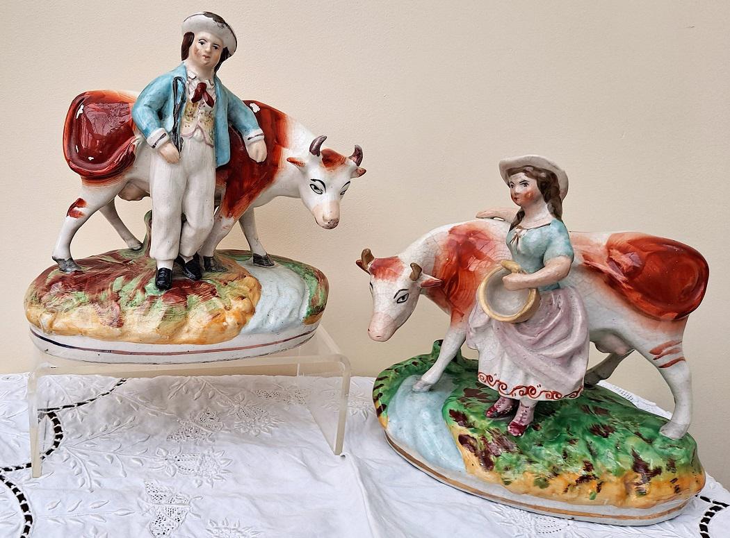 Pair of Antique English Victorian Staffordshire Pottery Figures - Milkman & Milkmaid with Cows - H 2314d / H 2314c