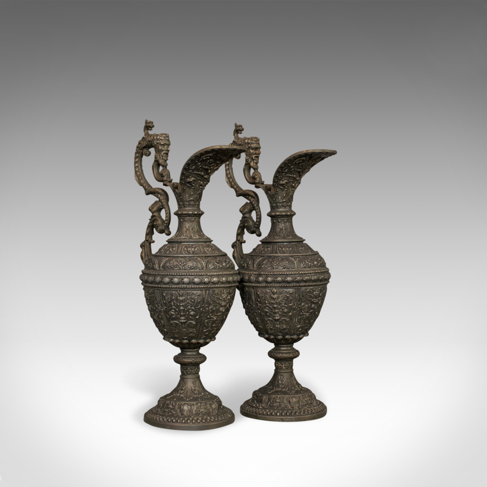 Pair of Antique Ewers, Classical Taste, French, Bronze Spelter, Jug, Pitcher